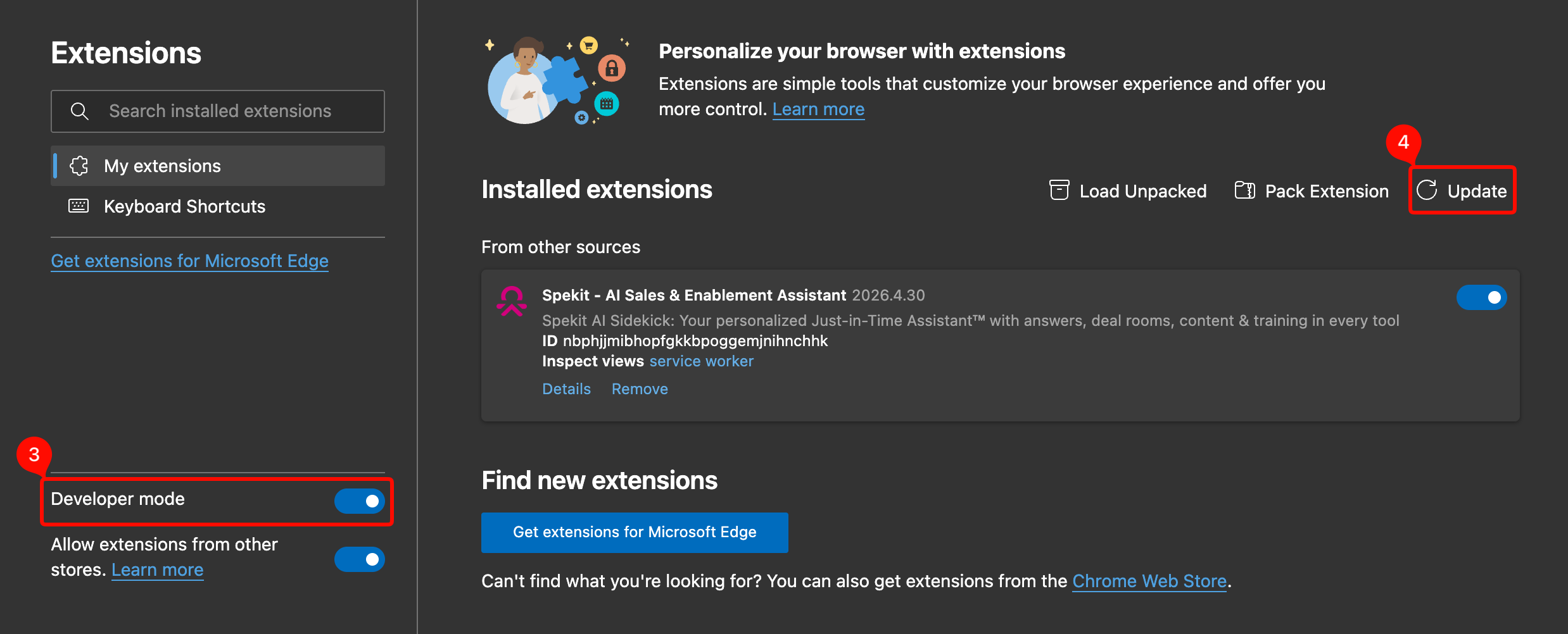 3 ) Enable the "Developer mode" toggle on in the top right (Note: If the "Developer mode" toggle is grayed out then your organization may block this. See below for alternative update methods)