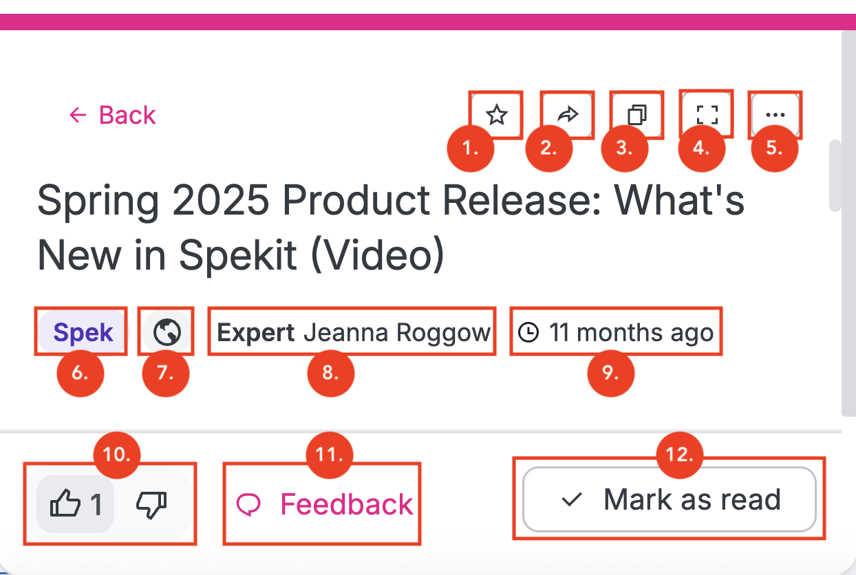 For Admins/Experts: Opens the Spekit Help Center. For Viewers: Opens an "Ask an Expert" prompt to send a direct question to the assigned content Expert (or a default fallback email). |