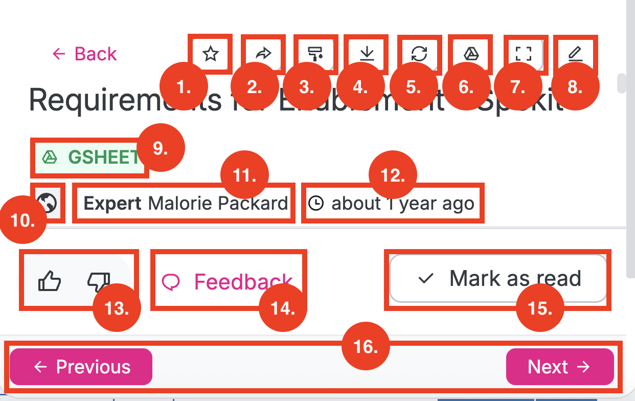 - Expert: View the assigned Expert responsible for the contentâs accuracy. Reach out to them if something looks outdated.