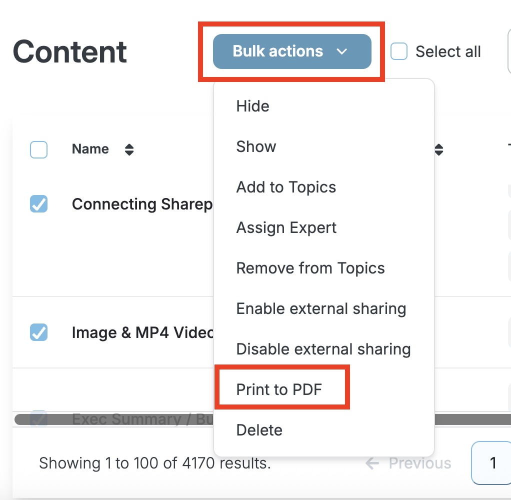 Click Bulk Actions → Print to PDF